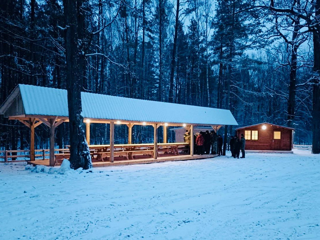 На территории вольера имеется: парковка для автомобилей, беседка, оборудованное кострище, домик для отдыха.
