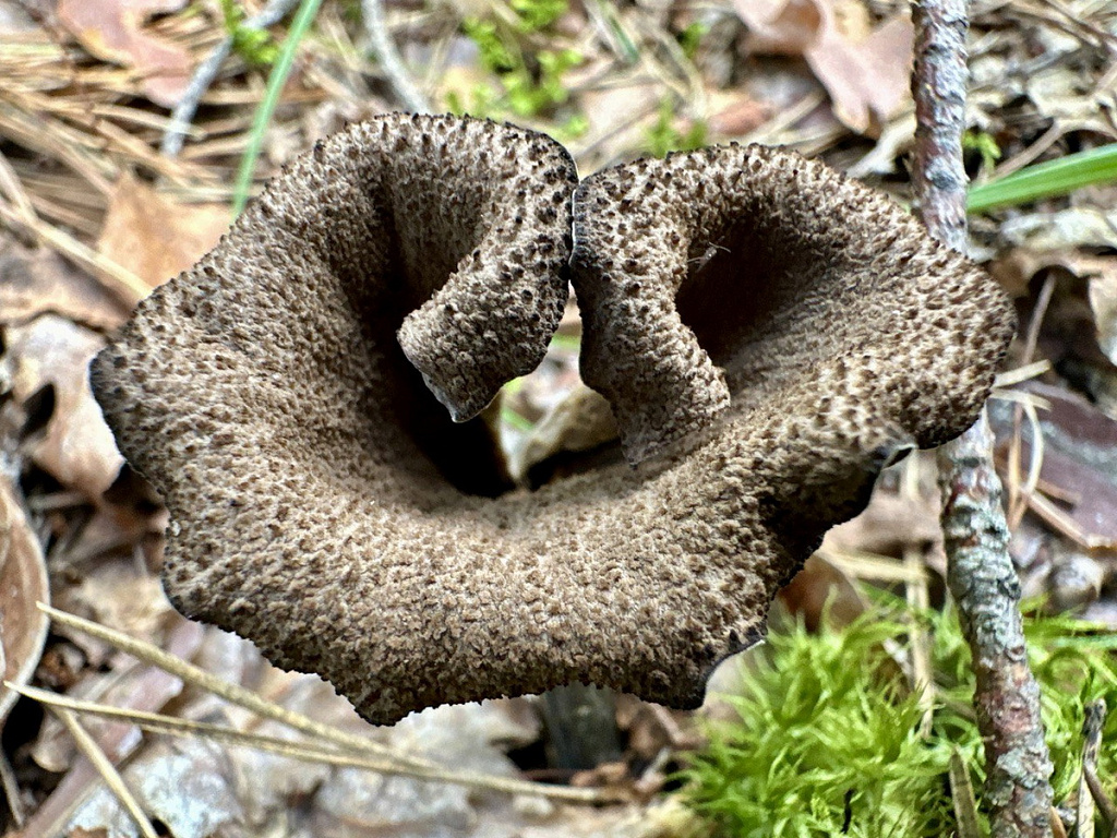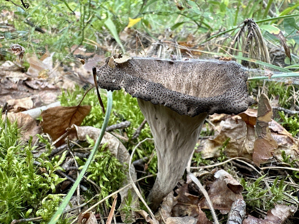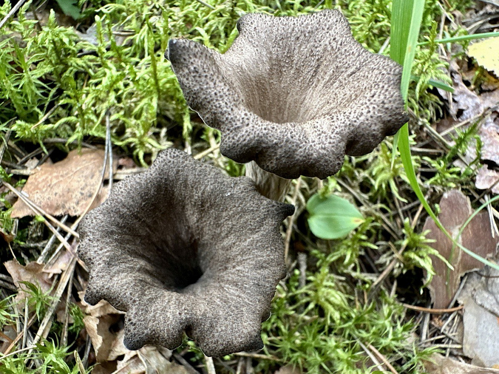 Чёрная лисичка или вороночник рожковидный отличается необычным внешним видом. Шляпка имеет воронкообразную форму с волнистыми краями, окрашена в тёмно-серый или чёрный цвет с отсутствием псевдопластинок. Ножка тонкая, длинная. Произрастает с июня до осени, наиболее активен в августе-сентябре.